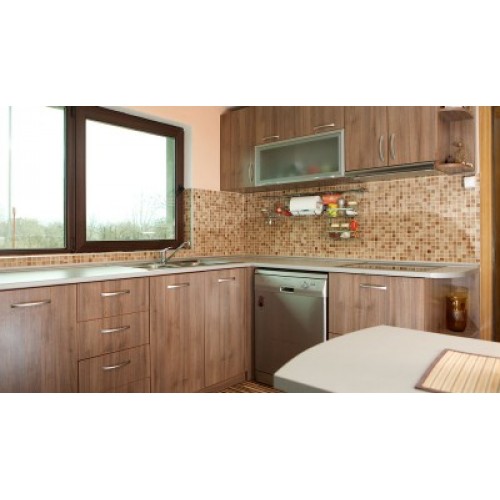 Кухня по индивидуален проект, изработена от ламинирано ПДЧ 18 мм, PVC kант 2 мм и термоустойчив плот 28 мм с гетинаксово покритие.